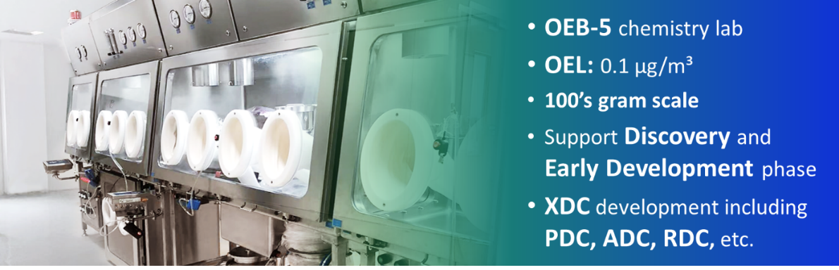 The new OEB-5 lab is equipped to ensure the safe and efficient production of high potent compounds, and incorporates isolators, closed-system reactors, and a dedicated HEPA-filtered HVAC system. Its potent handling rating means that trained technicians can operate safely within an OEL of as little as 0.1 micrograms per cubic meter.