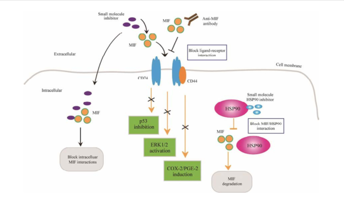 MIF is a classic pro-inflammatory factor that participates in the regulation of innate and adaptive immune responses. A large number of studies have shown that the expression of MIF is significantly increased in a variety of tumor tissues, promoting tumor growth, metastasis, angiogenesis, and inducing the formation of a tumor-promoting immune microenvironment. In view of the important role of MIF in tumorigenesis and development, targeting MIF is considered a potential strategy for tumor treatment.