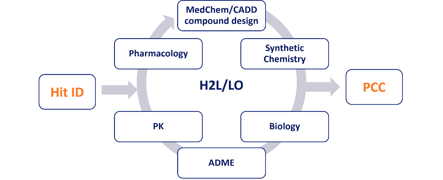 H2L - Focus on creating novelty and FTO through scaffold-hopping, nitrogen-walk, unique building blocks, while monitoring drug-likeness parameters and ADME early; taking advantage of handles for quick parallel SAR exploration.