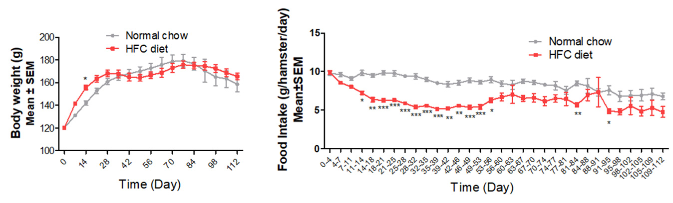 Significantly higher liver weight live to body weight ratio, ALT in HC +fructose fed Hamster