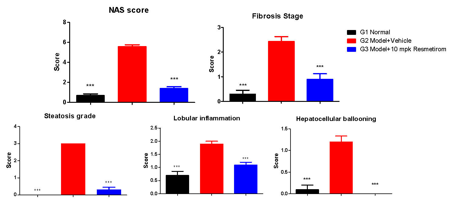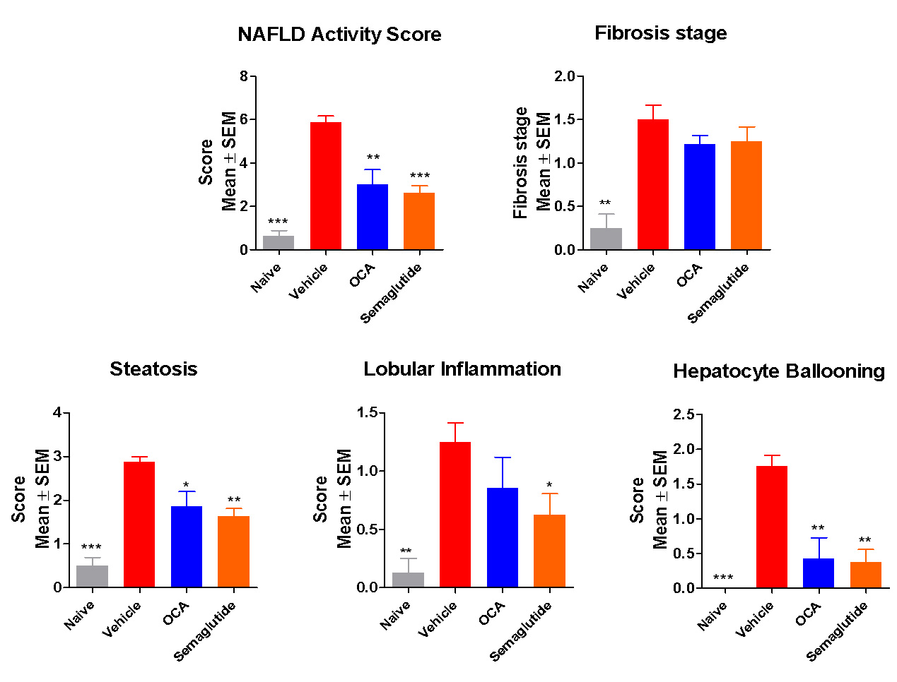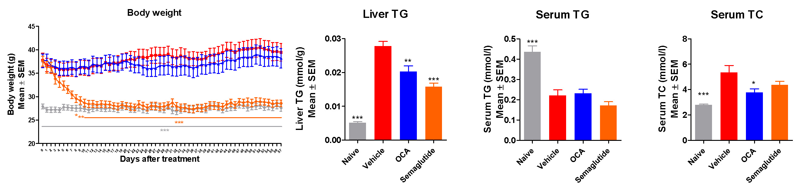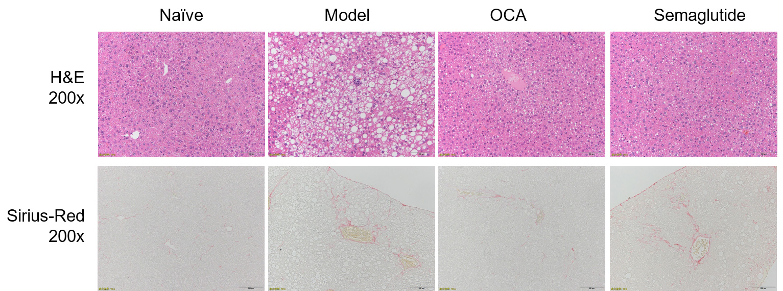 Validation studies conducted with our MASH models using OCA, semaglutide, and GFT505. Both OCA and semaglutide resulted in reduced liver enzymes, reduced cholesterol, lowered body weight, liver triglycerides, and a lowered NAS score.