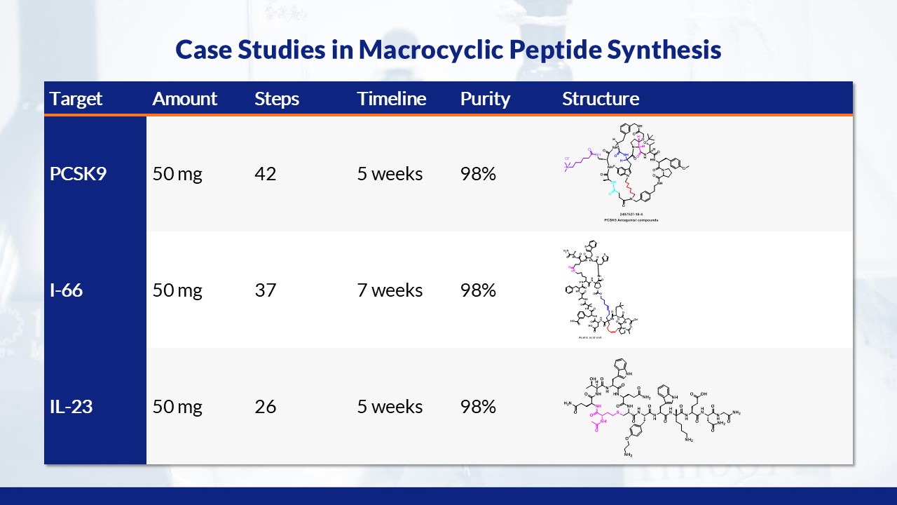 Our broad peptide synthesis capabilities support a variety of peptide catalogs including linear, cyclic, modified, and conjugated peptides.