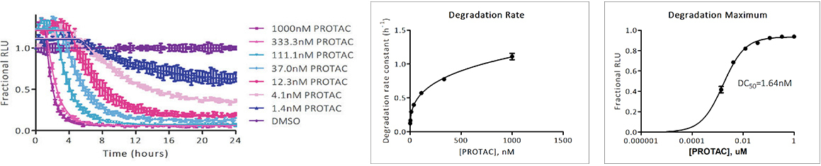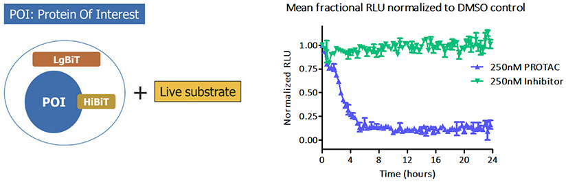 Monitor endogenous target protein degradation through large variety of cell-based assays (lytic and kinetic HiBiT, NanoLuc, Simple Western on JESS, In-cell ELISA, AlphaLISA, Western Blot, FCM)