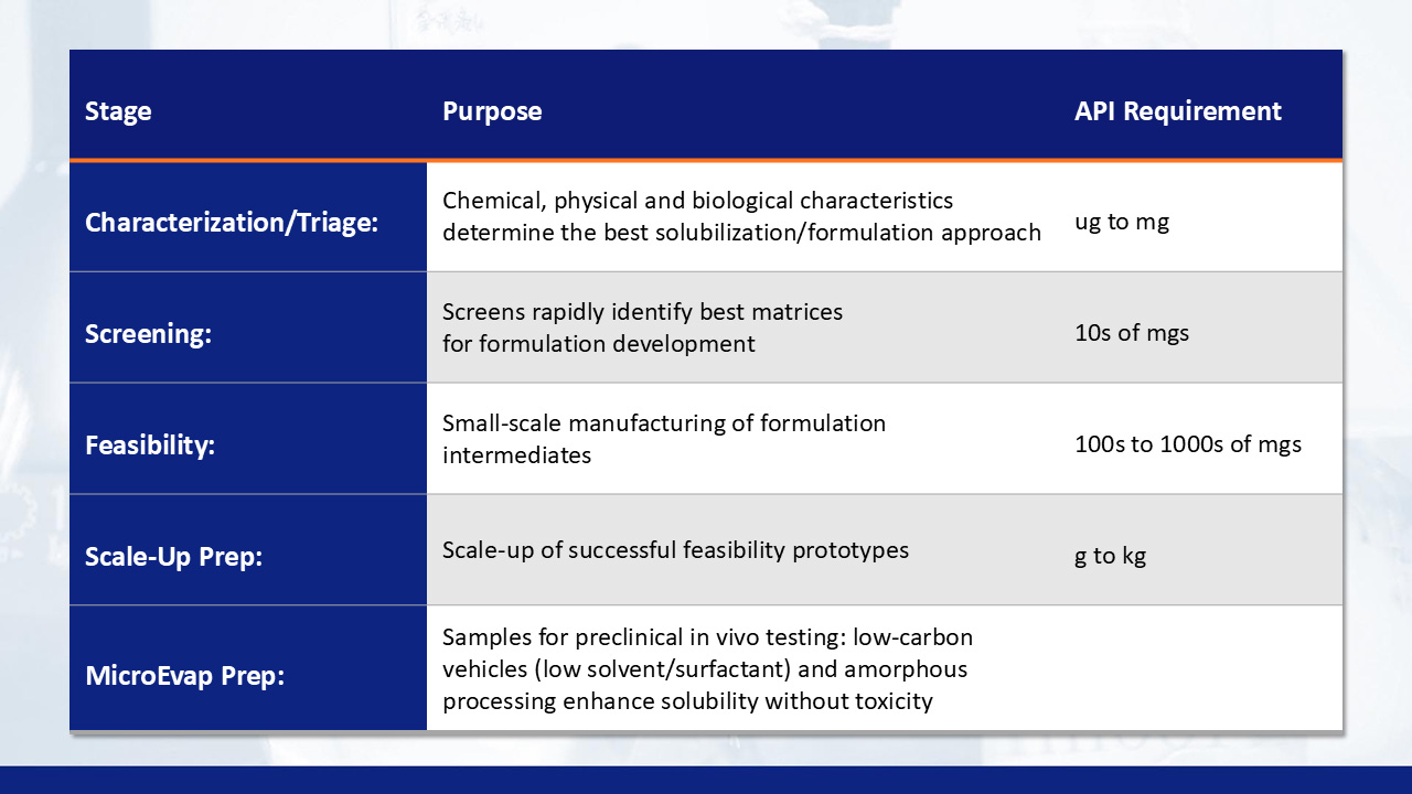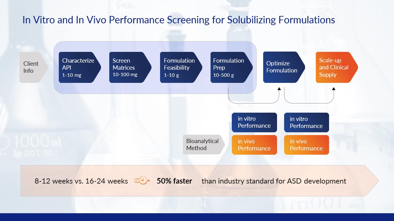 Next, ASD stability studies utilize small-scale spray dried dispersion (SDD) and/or hot melt extrusion (HME) to characterize drug-polymer combinations for amorphous content determination (XRPD), thermal properties (mDSC and TGA), assay/related substance and in-vitro non-sink dissolution before being staged in ICH accelerated stability chambers. The ASDs with the highest stability proceed to further in vivo PK studies and selected for process scale-up and manufacturing.