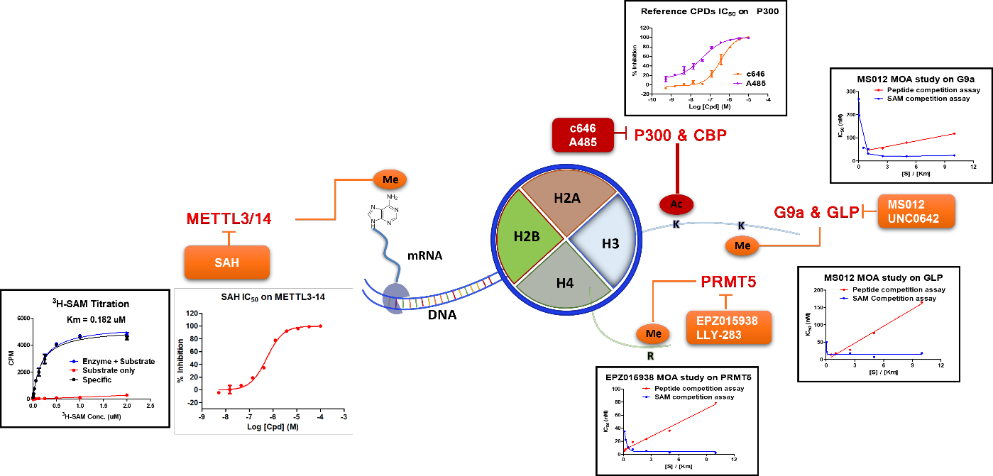Integrated compound screening and MOA study services for epigenetic targets including METTL3/14, P300&CBP, G9a&GLP and PRMT5;